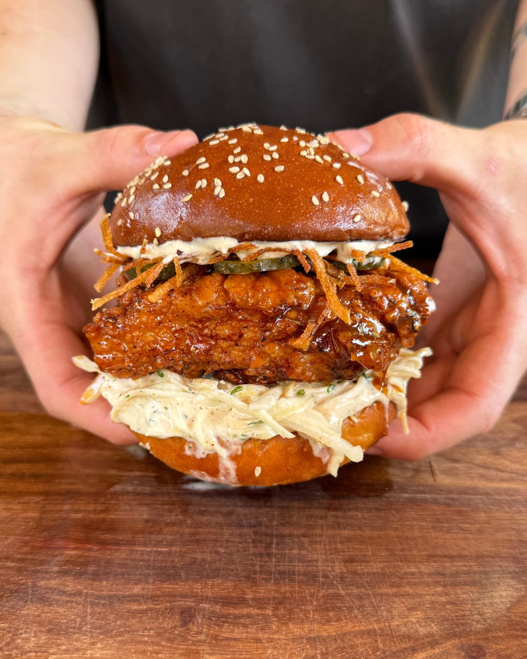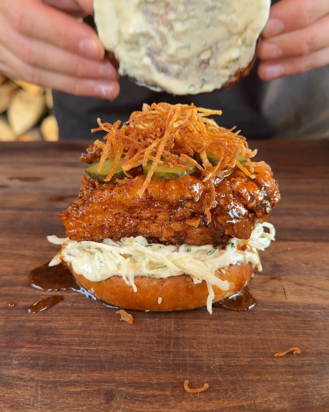 Lastly, try to build the burger while the chicken is frying. That way, once the chicken is glazed, you can add it straight in, close the burger, and eat.