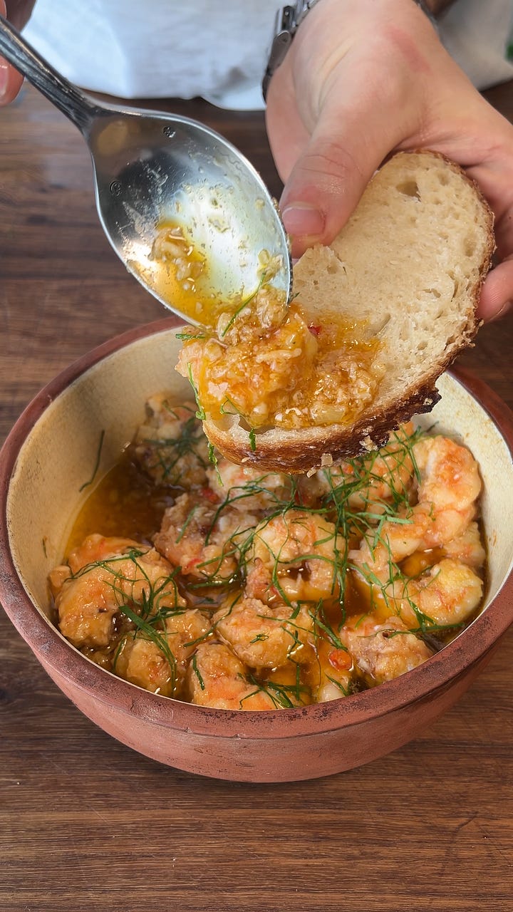 Alongside it was a basket of fresh, steamy ciabatta. My auntie told us to tear off some bread, dunk it into the oil, and place a prawn on top. Holy moly. The explosion was unreal. I was instantly hooked.