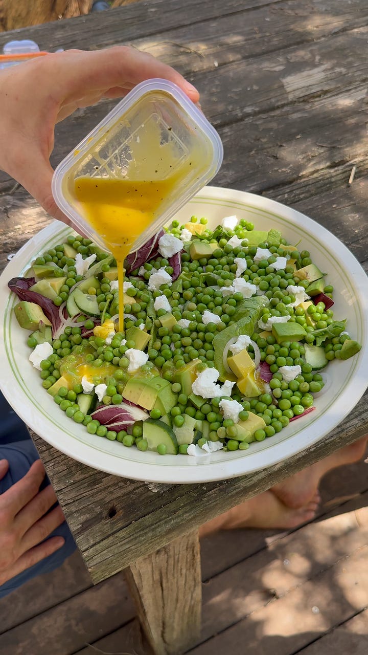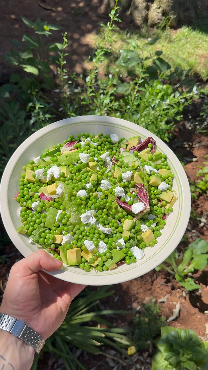 In a large bowl, combine Italian leaves, peas, shallot, avocado and goat’s cheese.