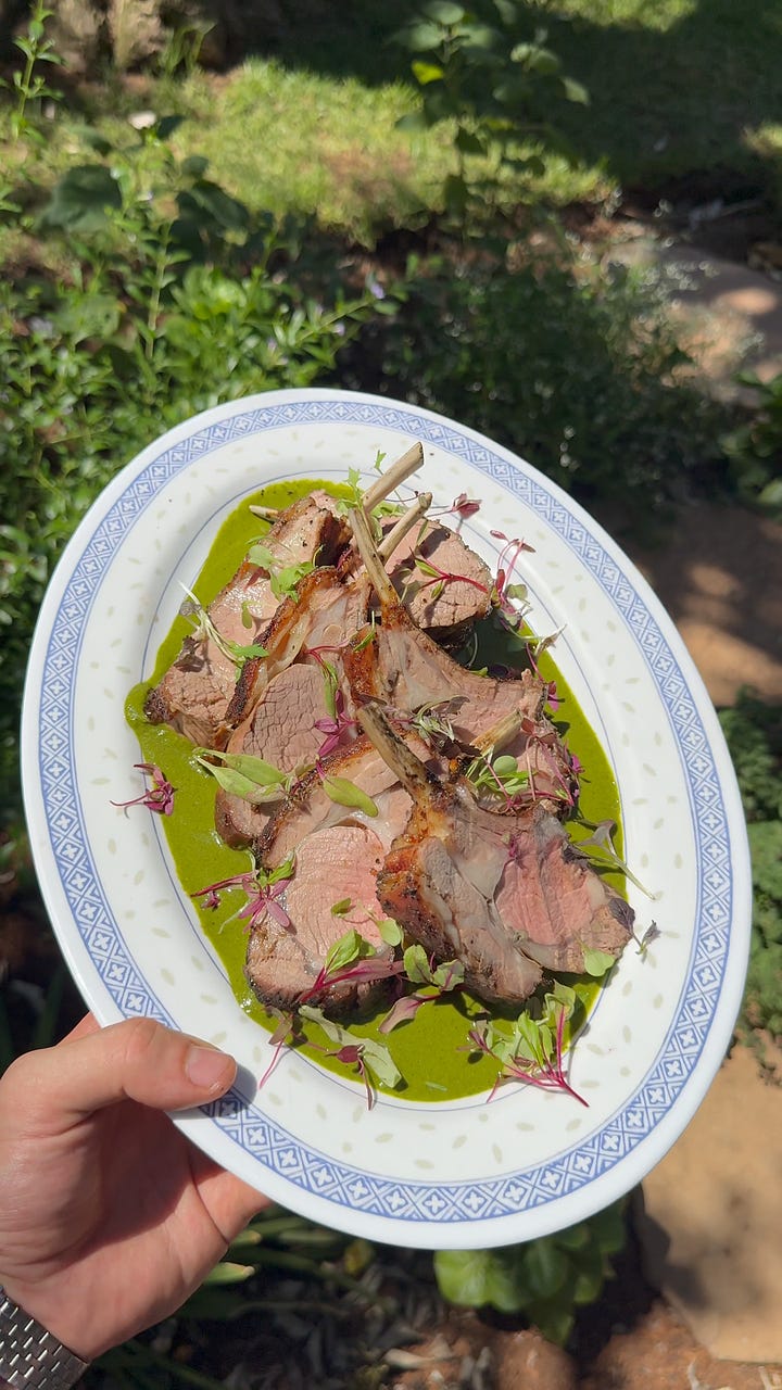 Slice between the bones then serve on a bed of mint sauce and garnish with microherbs.