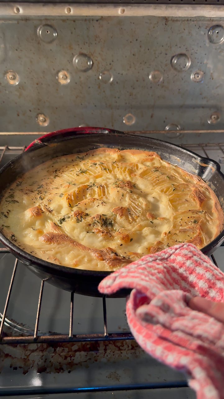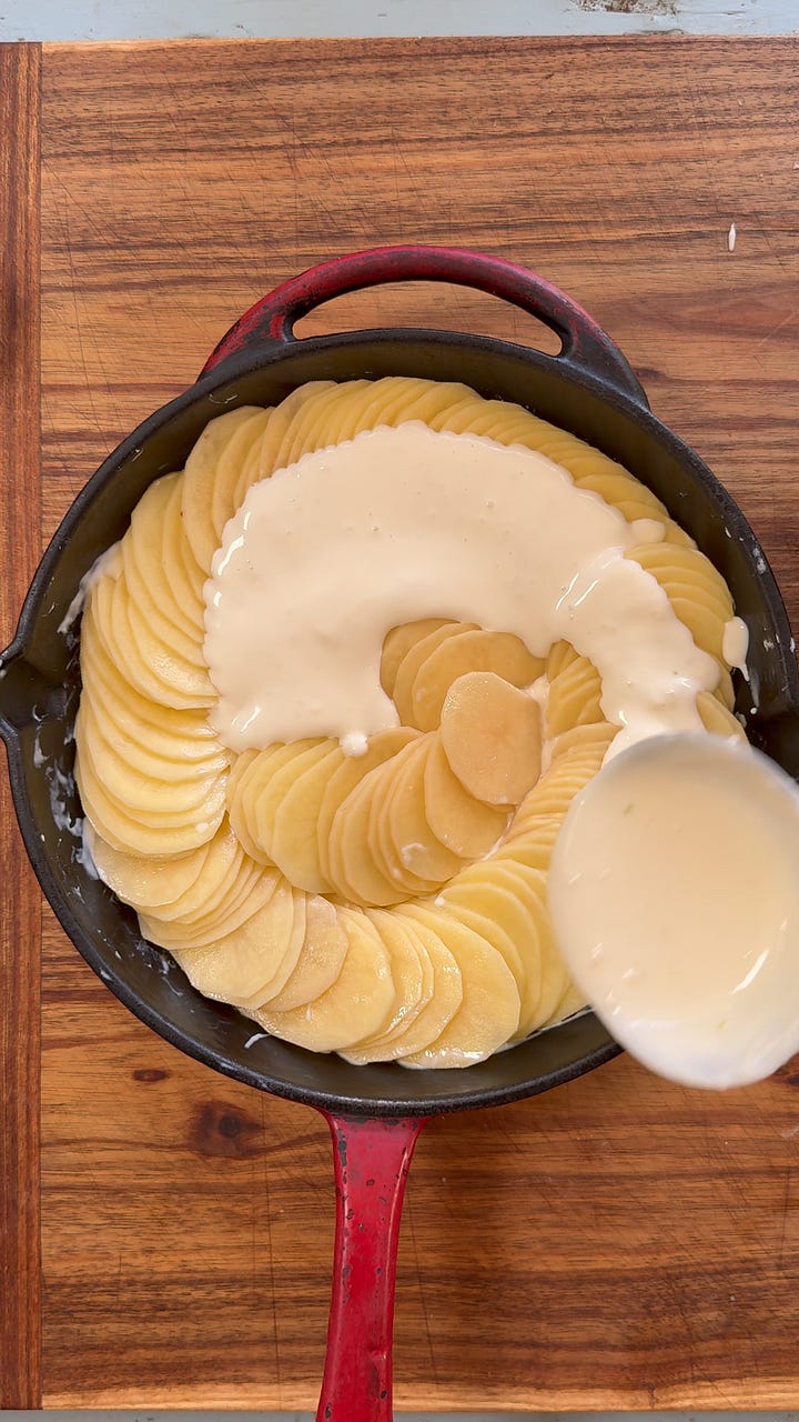 Slice the potatoes on a mandolin if you have one. Layer sliced potatoes,in a cast iron pan or baking dish. Pour over the béchamel and top with a generous layer of cheddar and finish with a sprinkle of thyme leaves.