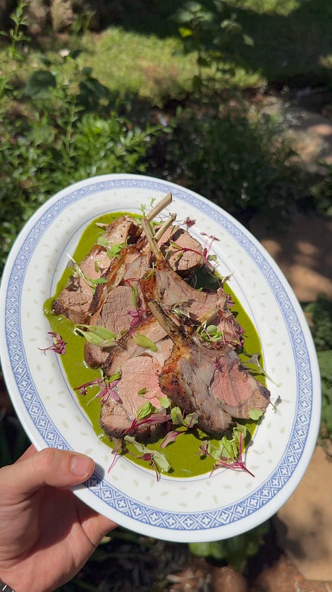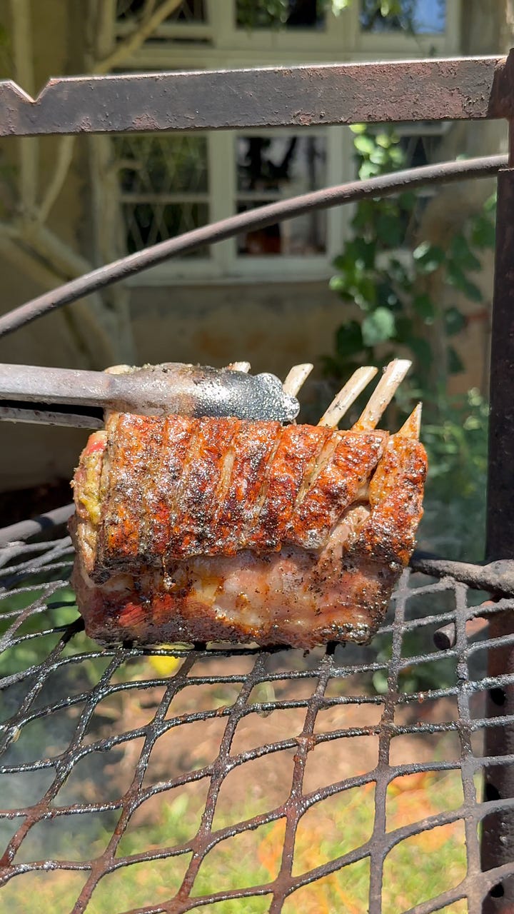 Braai over medium-low coals, fat-side down first, until nicely caramelised. Then continue to cook slowly, bone sides down for around 60-90 minutes, making sure to continually baste with the sauce throughout. You want the lamb fat to drip away while not overcooking the middle, so keep the heat low and consistent. I explain how I build my braai to have a continuous flow of coals in the above newsletter.