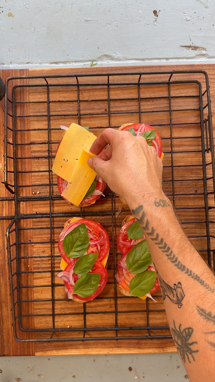 Slice the ciabatta and build the toasties in the following order: cheddar, onion, tomato, basil, an optional hit of chilli, more cheese, then close the sandwich.