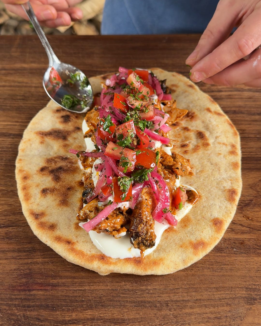 This one is a little in-between a shwarma and a gyros. It has the warm, spiced flavours of a shawarma but with the creamy tzatziki of a gyros - not traditional but lets be honest,I’m never saying no to tzatziki. It has toum and sumac onions aswell with a bit of freshness coming in from the tomato salad. Every bite is a good one.