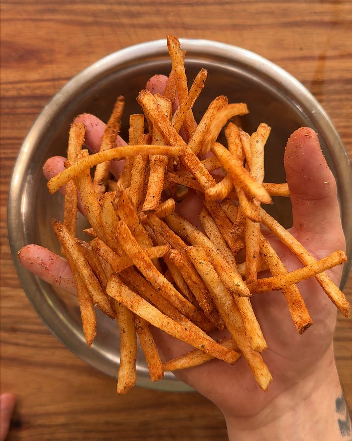 Immediately add the fries to a large bowl after frying, then hit them with a few big pinches of the dry spice mix.