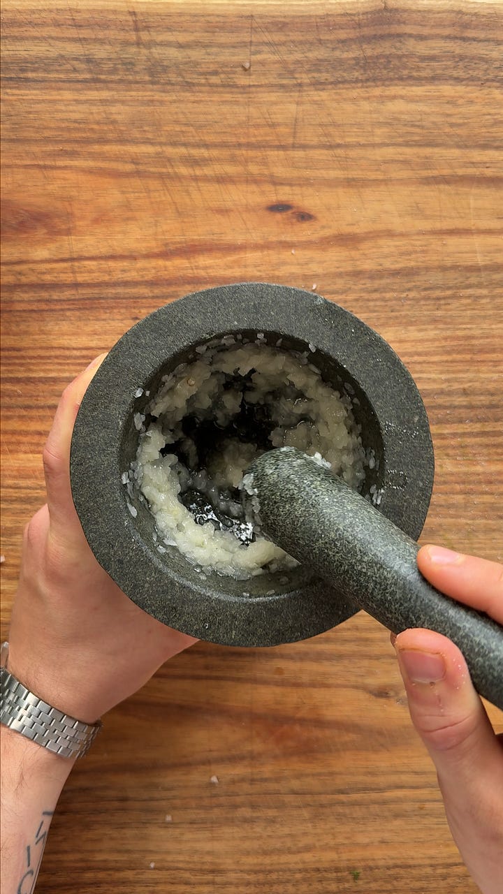 In a mortar and pestle, mash the finely chopped onion with a pinch of salt until it is a paste.